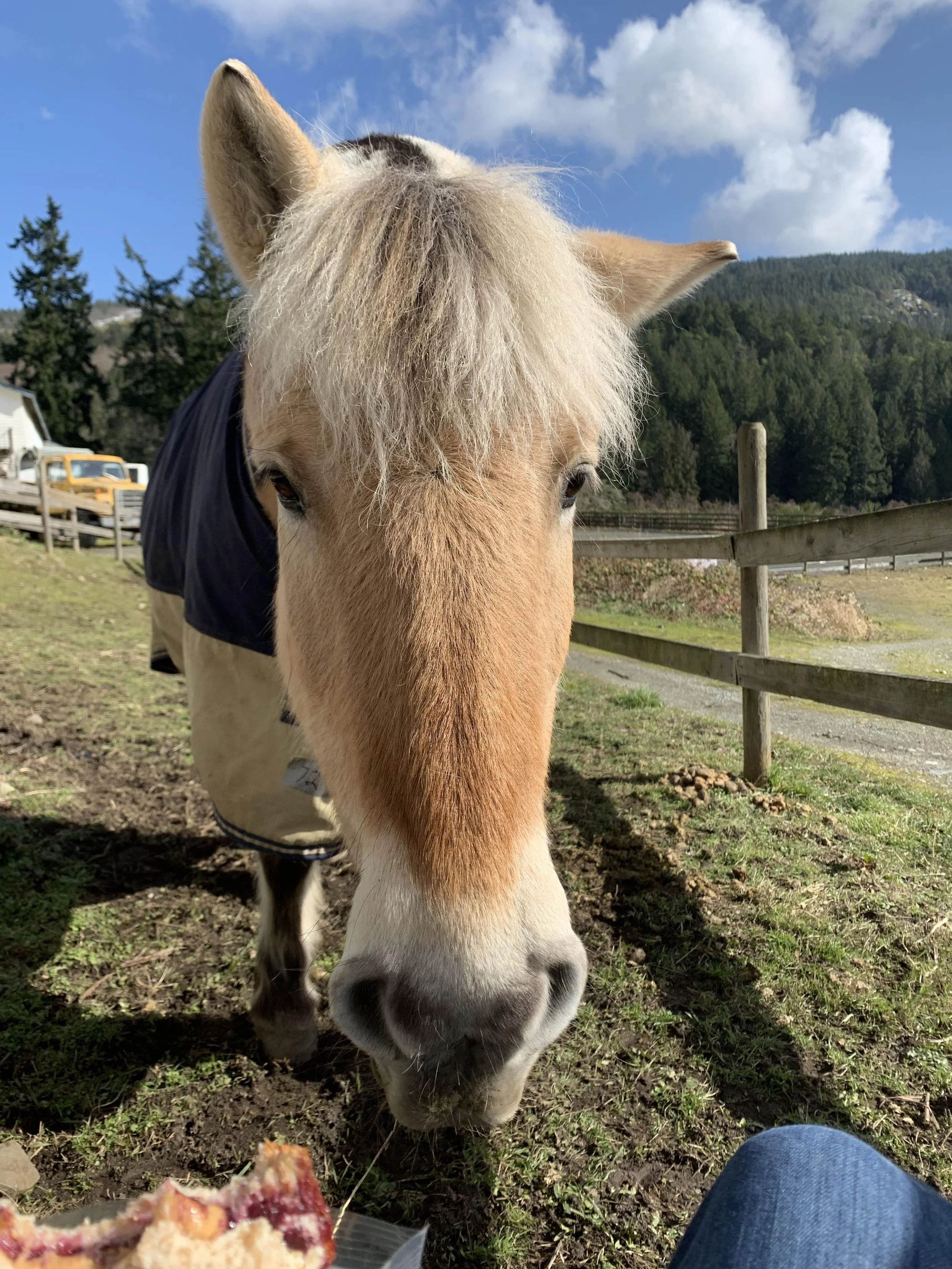 Ember has been a part of the CTRA team longer than any of our other horses. This senior Norwegian Fjord mare used to be a pack horse in the interior, before changing careers to become a therapy horse extraordinaire. Quiet and gentle, Ember takes many of our riders who require a leader and two side-walkers, and she loves doing obstacle courses with them. Ember’s favourite thing in the whole world is eating, and a close second is going out for a trail ride. Ember achieved international stardom starring in the “Ember Had A Dream” Video in 2018.